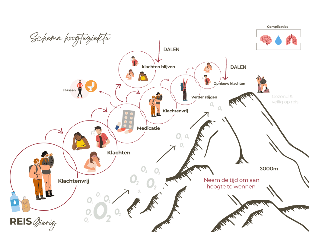 Op grote hoogtes is de luchtdruk lager, waardoor er minder zuurstof in de lucht zit. Je lichaam probeert dit te compenseren door sneller en dieper te ademen en je hart harder te laten werken om zuurstof door je lichaam te pompen. Deze aanpassingen kosten tijd (acclimatisatie), en als dit proces te snel verloopt, kunnen er problemen ontstaan.