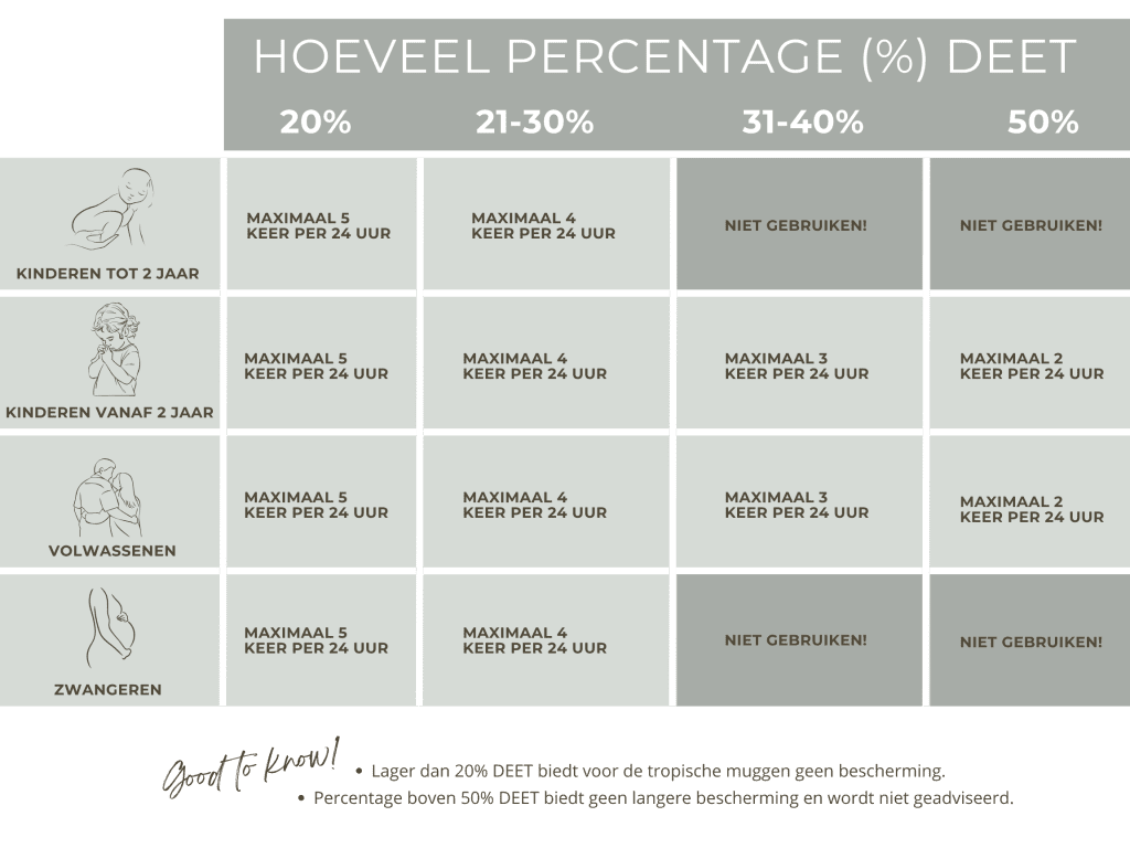 Van zodra de zon opkomt tot de zon weer ondergaat is de tijgermug actief. Deze mug brengt verschillende tropische ziektes met zich mee waaronder Dengue en Zika. Daarom is het extra belangrijk om je ook overdag of je nu in de stad bent of in de jungle je goed in te sprayen met muggenspray incl. DEET.