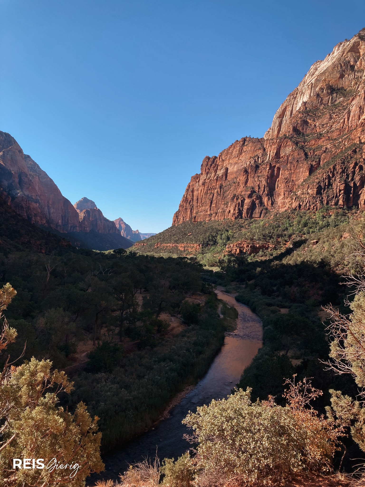Een van de populairste wandelingen is de Riverside Walk, een gemakkelijk pad van 3 km dat uitkomt bij het begin van The Narrows,  een spectaculaire kloof waar je letterlijk door het water van de Virgin River wandelt. Echt een heel leuke ervaring! Je kunt in Springdale waterschoenen en wandelstokken huren, maar die heel duur en in mijn ogen onnodig zijn. Wie jong en stabiel op de benen is, kan de tocht prima doen op gewone sneakers (die daarna natuurlijk nat zijn).