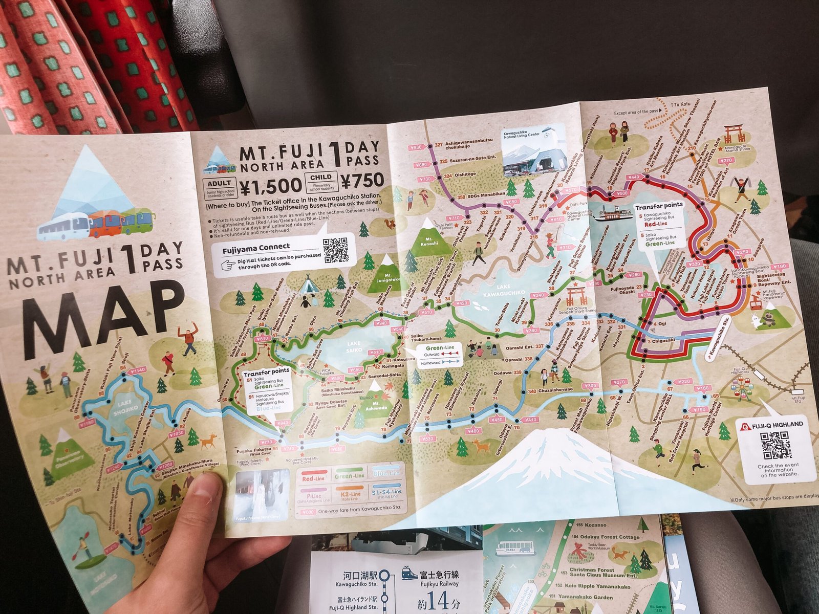 De rechtstreekse trein vanuit Tachikawa naar Kawaguchiko gaat ongeveer één keer per uur, dus het is slim om van tevoren de dienstregeling te checken en je treinreis goed te plannen. En als je zeker wilt zijn van een comfortabele zitplaats, raden we je echt aan om van tevoren een stoel te reserveren. Wij hebben ervan geleerd, maar gelukkig maakte het prachtige uitzicht op Mount Fuji bij aankomst alles weer helemaal goed!