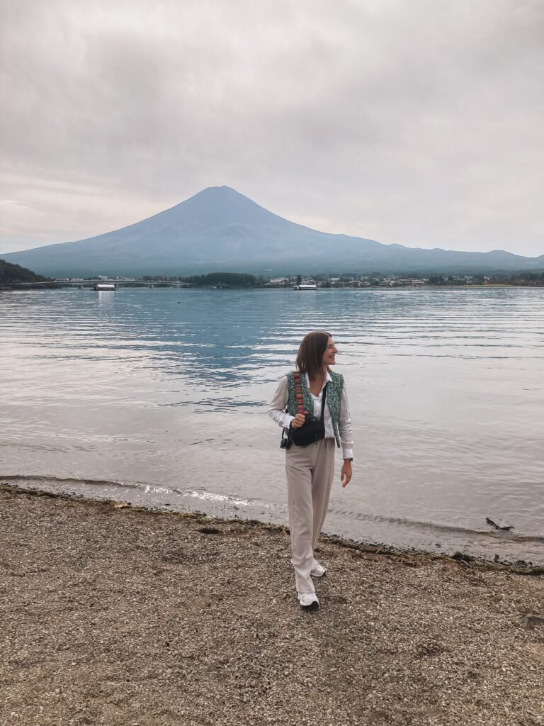 Na al het geregel, de frustratie en de onverwachte extra kosten konden we eindelijk gaan genieten van onze dag bij Mount Fuji. We namen de bus richting Lake Kawaguchiko, stapten ongeveer halverwege uit en besloten langs het meer terug te wandelen. En eerlijk? Alle frustratie viel meteen van ons af toen we daar liepen. Het uitzicht op Mount Fuji, weerspiegeld in het kalme water van het meer, was echt adembenemend. Wauwie!