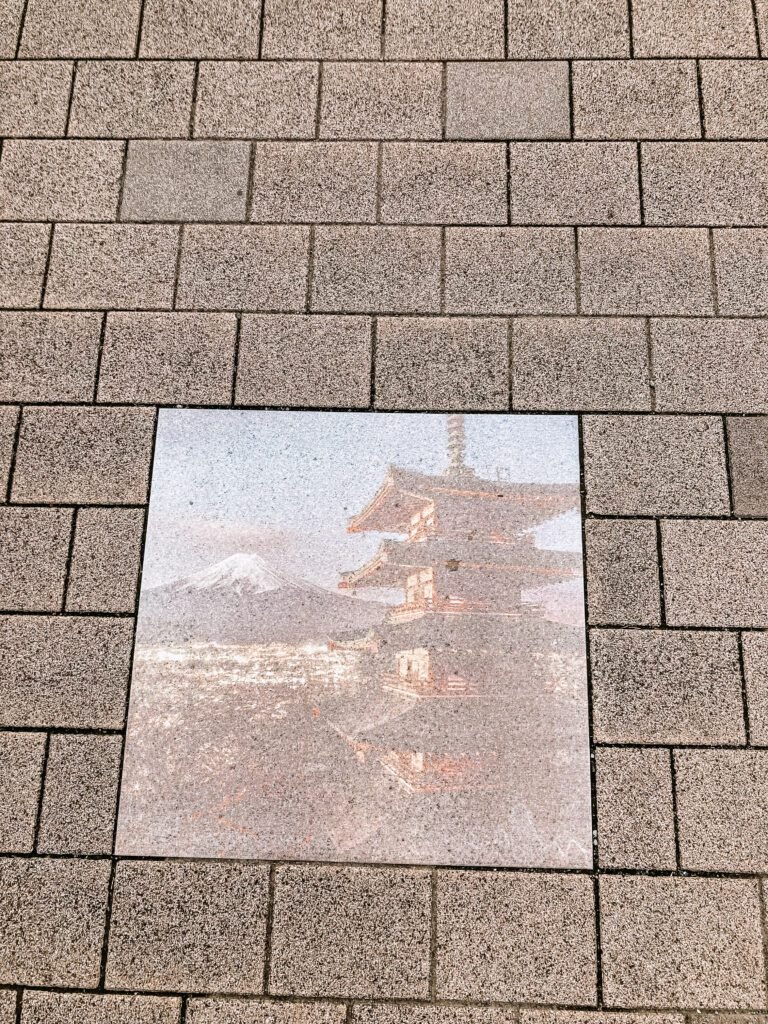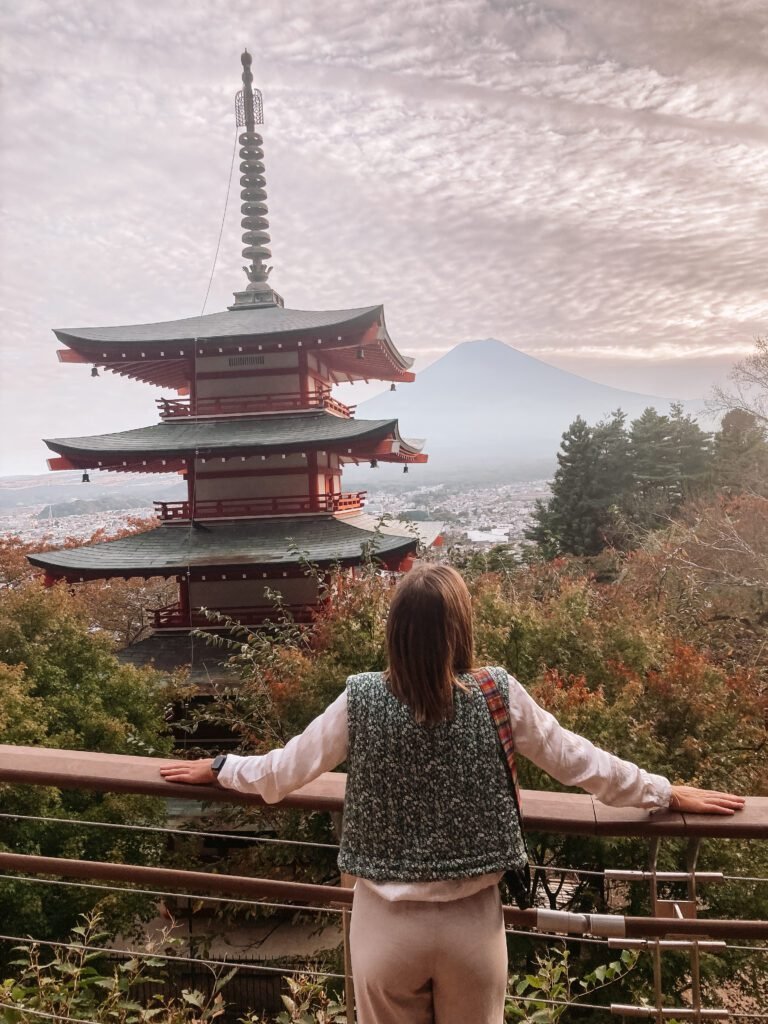 Ondanks dat we maar één dag bij de iconische Mount Fuji doorbrachten, hebben we deze indrukwekkende berg op verschillende manieren en van diverse hoeken kunnen bewonderen. We hebben een aantal adembenemende uitzichtpunten ontdekt die ons echt een beeld gaven van de veelzijdigheid van deze natuurwonder. We begonnen de dag met een prachtig panoramisch uitzicht vanaf de top van de berg bij de Chureito Pagoda. Om daar te komen, moet je eerst de trein nemen, 10 minuutjes wandelen tot het beginpunt (wordt aangeduid met speciale stenen op de grond) en daarna een pittige klim. Het is een behoorlijk uitdagende klim, maar het uitzicht is absoluut de moeite waard. De uitzichten over Mount Fuji zijn werkelijk ondenkbaar.