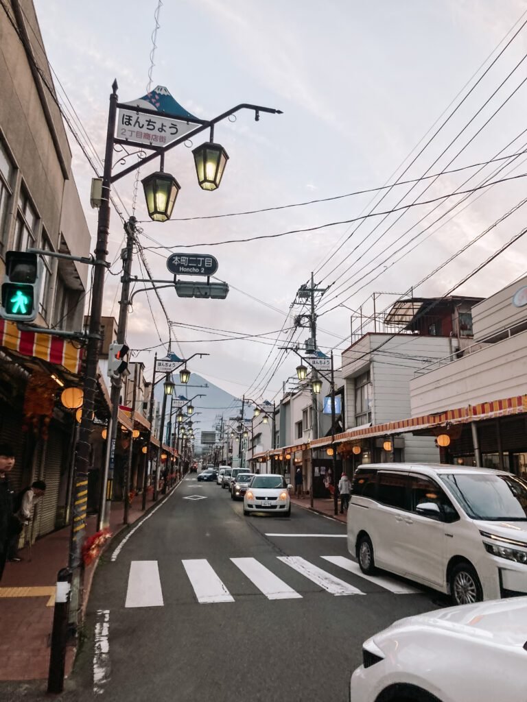 Tot slot wandelden we door de historische straten van Shimoyoshida, langs de Honcho Street, waar Mount Fuji tussen de traditionele gebouwen door te zien is. Deze straat heeft een bijzonder charmante sfeer en is echt een must-see. De berg vormt het perfecte decor voor een wandeling, en het is zo bijzonder om de berg te zien opkomen tussen de straatjes van dit oude Japanse dorp.